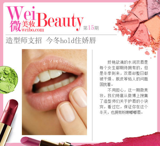微美妆第15期:造型师支招 今冬hold住娇唇首先我们要知道双唇为什么容易干裂,为什么唇部的纹路特别容易形成,其实这都是因为双唇没皮脂线、汗线无法分泌油脂水分保护唇部。