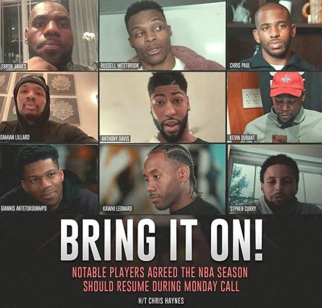 随后雅虎记者Chris Haynes在电视节目中爆料,多位NBA球员在当地时间周一,进行过线上私人会议,商讨关于复赛的可能性。最终所有参会人员一致表示:在今后采取恰当安全措施的条件下,他们相信应该继续打完本赛季的比赛。