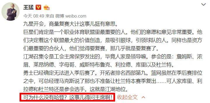 哈登本赛季场均34.4分6.4板7.4助,是目前NBA的得分王、联盟前十的巨星,难道不配参会?更有人提出这样的说法:会议是由保罗牵头召开的,所以没请哈登,理由你们也懂。连篮球解说王猛都来吃瓜……