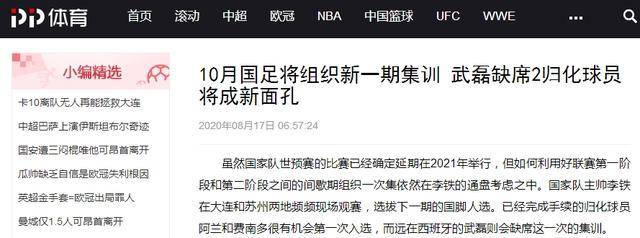 虽然40强赛延期到明年进行,但是国足主帅李铁依然要在10月份组织集训,目前李铁在大连和苏州两地频频现场观赛,选拔下一期的国脚人选。据PP体育的消息,阿兰和费南多两大归化球员将会成为国足新一期名单的新面孔,同时国足头号球星武磊将会缺席本次集训,而高拉特和蒋光太都暂时没有机会入围。