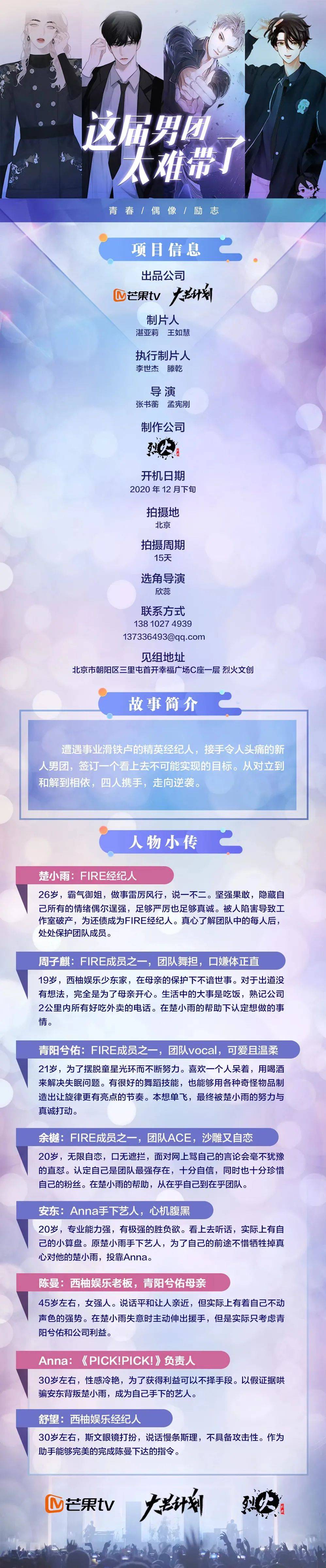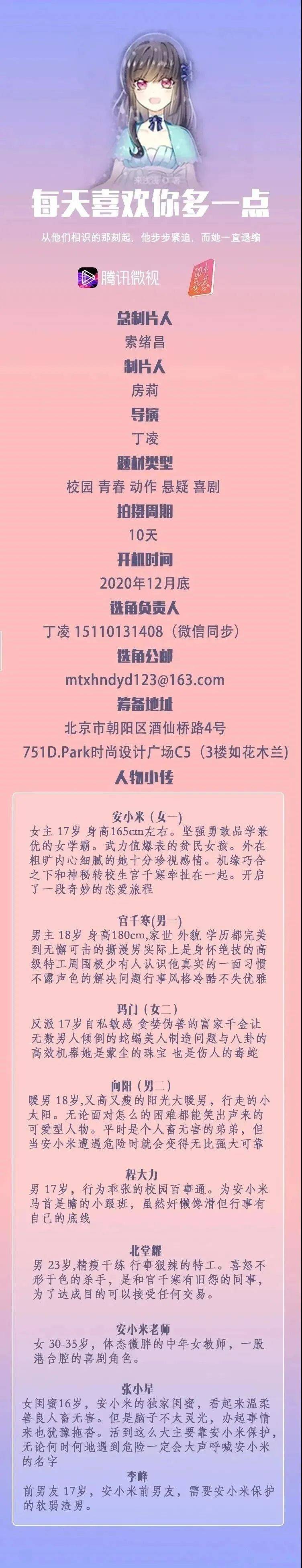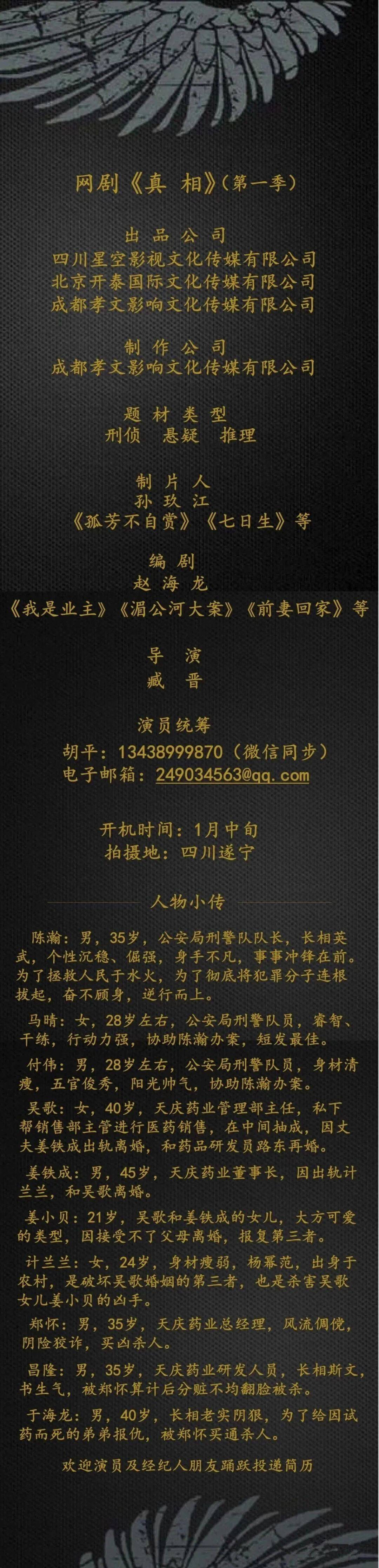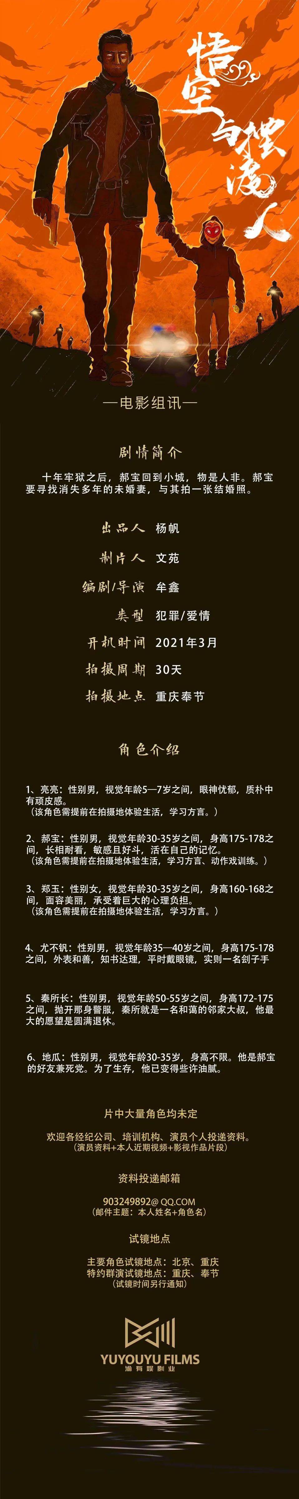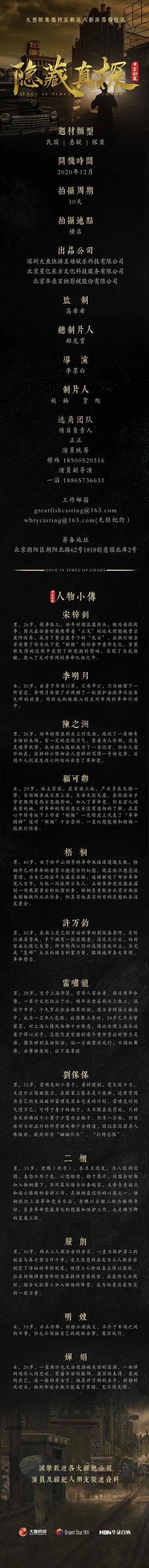 片中大量角色均未定,欢迎各经纪公司、培训机构、演员个人投递资料。