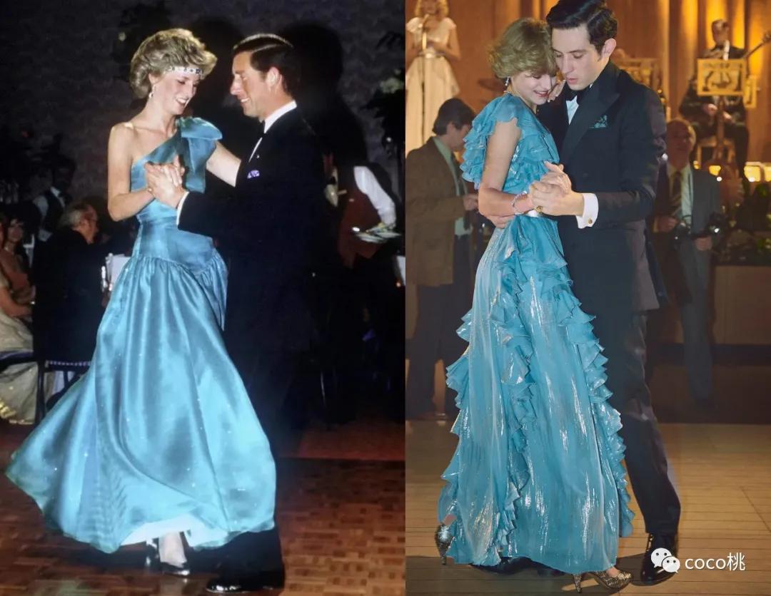 和原版的斜肩不同,剧中肩袖和裙摆层叠荷叶边的设计,随着舞姿的摇摆显得戴妃俏皮与活力的一面。