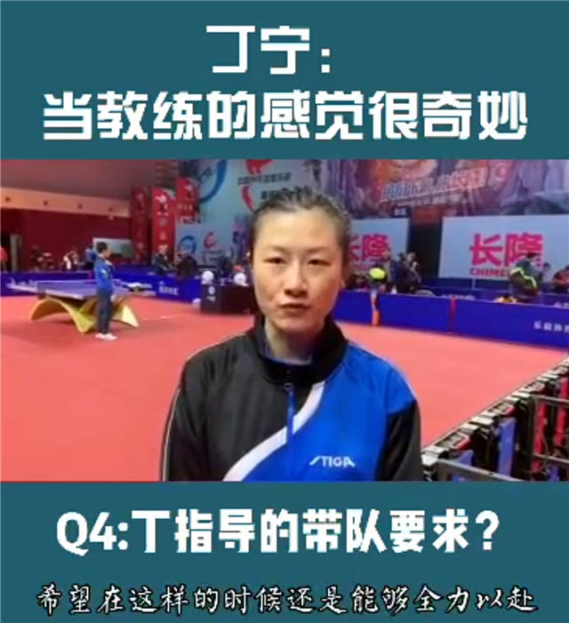 记者李武军在询问丁宁被队友们改称为"丁指"啥感受时,开朗的丁宁立刻就笑得合不拢嘴了,但她也亲承其实自己还是很不好意思的。丁宁表示,如今当了主教练,在进行赛前准备时就要进行全盘考虑,而且还要帮小队员们应对如何首次打乒超,以及帮小将调节连续被高水平对手打崩溃后的心理等问题。