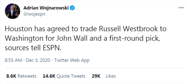 北京时间12月3日,据ESPN名记沃纳罗斯基报道,火箭已经和奇才达成交易协议,他们送出韦斯布鲁克,得到奇才的沃尔和一个首轮签。名记查拉尼亚跟进报道称,火箭得到的首轮签是2023年的受保护首轮。
