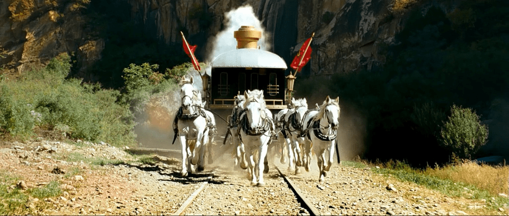 就像影片一开始,一辆火车奔驰在铁轨上,却是一群马在拉着火车跑。这是个视觉上极具电影奇观效应的名场面,让人印象深刻。然而它代表了什么呢?