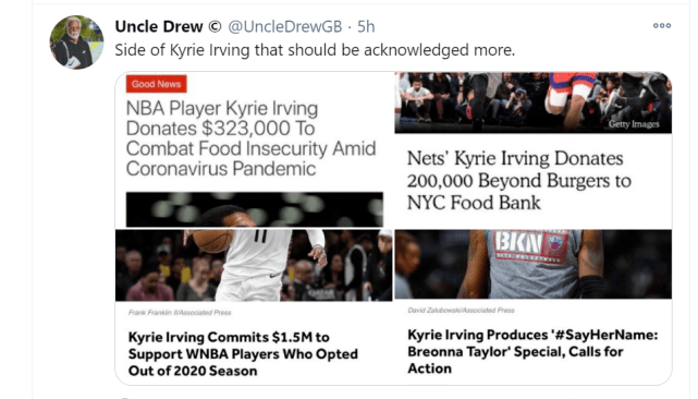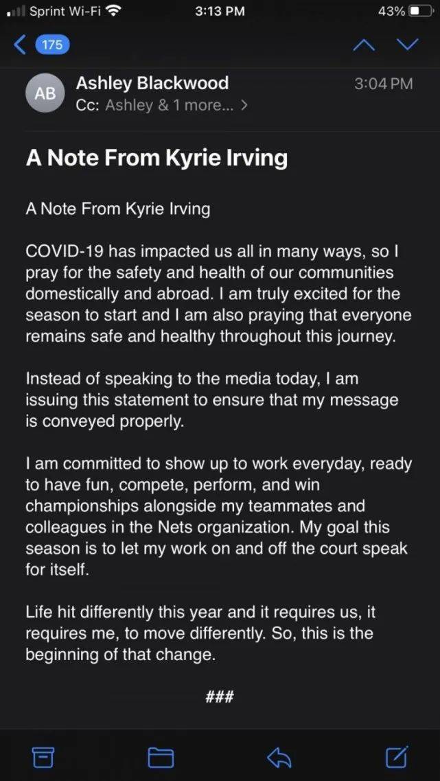 "我们注意到社媒上有一段欧文参加家庭聚会的视频。我们正与欧文本人以及NBA官方一起审查相关情况,以确认其行为是否符合联盟健康和安全协议。目前欧文由于个人原因仍暂未归队,他的回归时间也还没有最终确定。在这个时刻,我们依然会专注于球队的目标。当欧文准备好时,他将有机会来解释缺席的原因。"