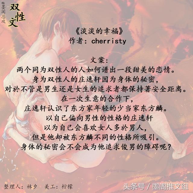 文案:两个同为双性人的人如何谱出一段甜美的恋情。 身为双性人的庄逸轩因为身体的秘密, 对於不管是男生还是女生的追求者都保持著安全距离。 在一次生意的合作下,庄逸轩认识了东方家年轻的少当家东方麟。 以自己偏向男性的性格的庄逸轩以为自己会喜欢女人多於男人, 但是他却被东方麟不同的性格所吸引。 身体的秘密会不会成为他追求俊男的障碍呢?