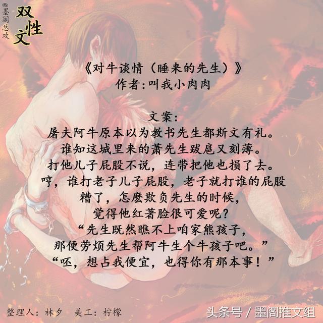 文案:屠夫阿牛原本以为教书先生都斯文有礼。谁知这城里来的萧先生跋扈又刻薄。打他儿子屁股不说,连带把他也损了去。哼,谁打老子儿子屁股,老子就打谁的屁股糟了,怎麽欺负先生的时候,觉得他红著脸很可爱呢?"先生既然瞧不上咱家熊孩子,那便劳烦先生帮阿牛生个牛孩子吧。""呸,想占我便宜,也得你有那本事!"