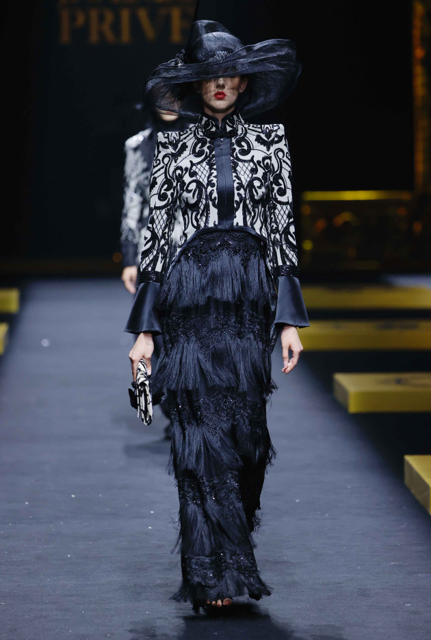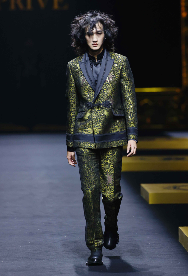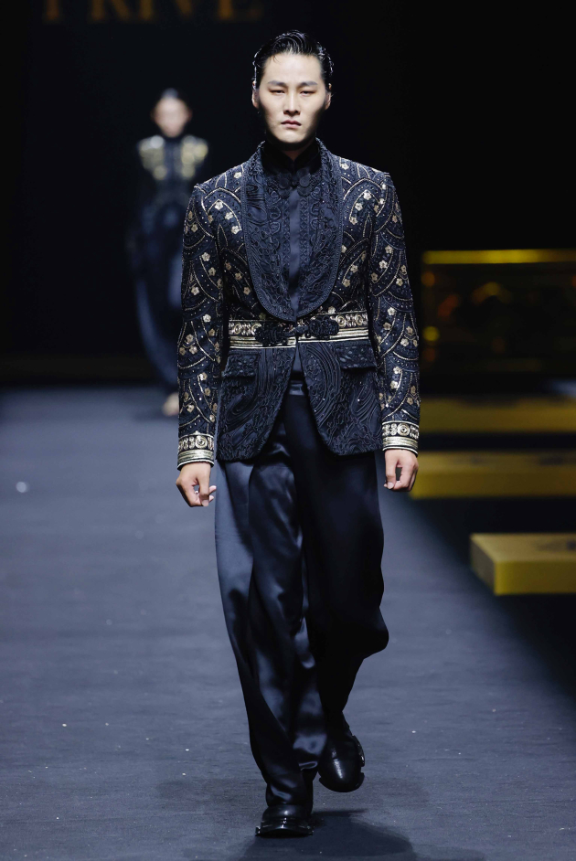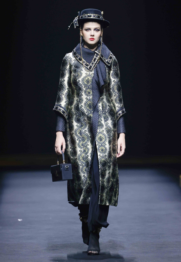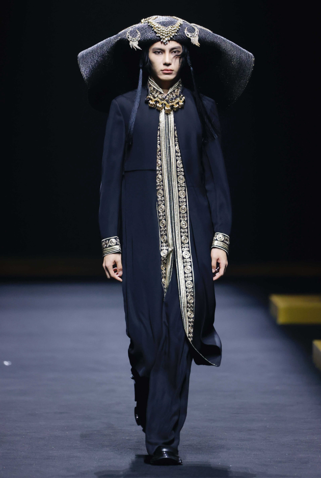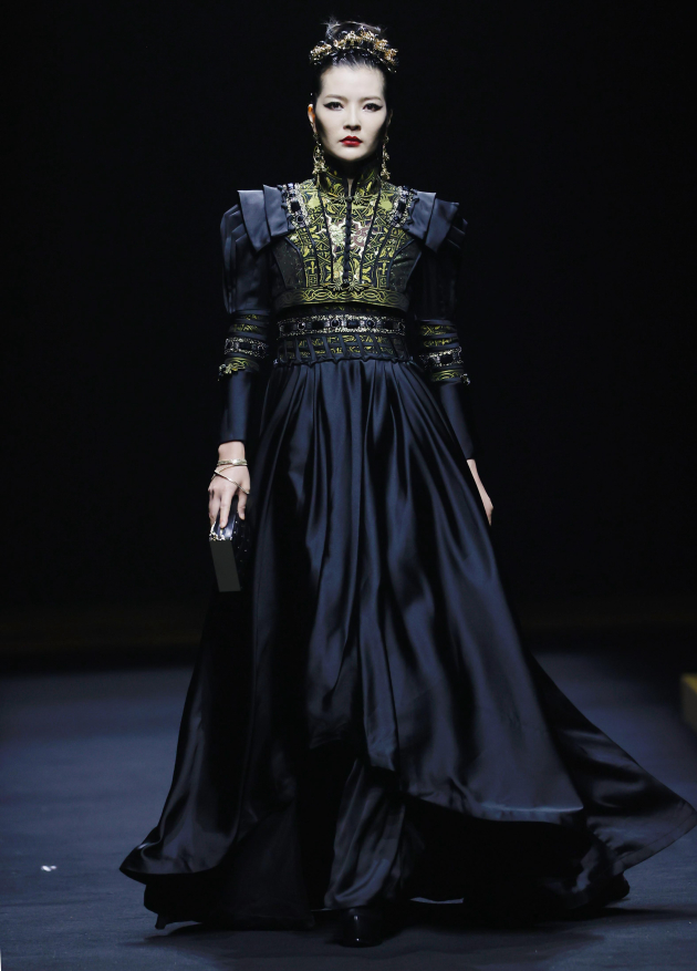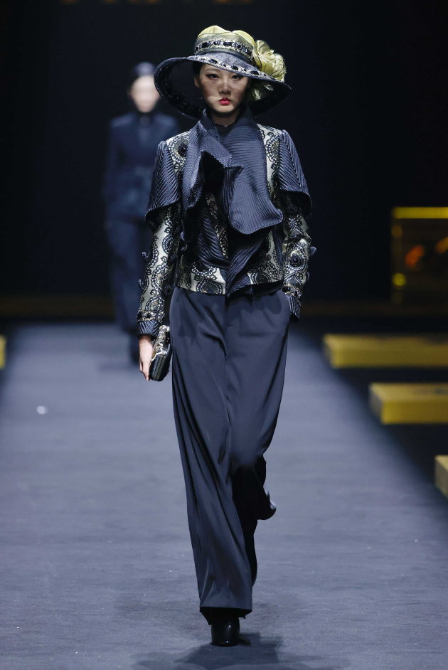 此次发布的服装以无彩色系、大地色系为主,搭配金色点缀,在视觉感官上色彩相撞却不轻佻,既不失高贵优雅、又不失东方的神韵。从色彩的构成上看,这一季的表达来源融合了中国古代建筑的骨骼、宗教的神秘、壁画的传神、书法的气韵……在这些服装上很容易就可以寻找到东方色彩的身影,设计师又通过更具世界化的色彩搭配构成了新时代的审美图卷,传统而不过时、时尚却又经典,这就是JIWENBO PRIVE和计文波为我们带来的色彩盛宴。