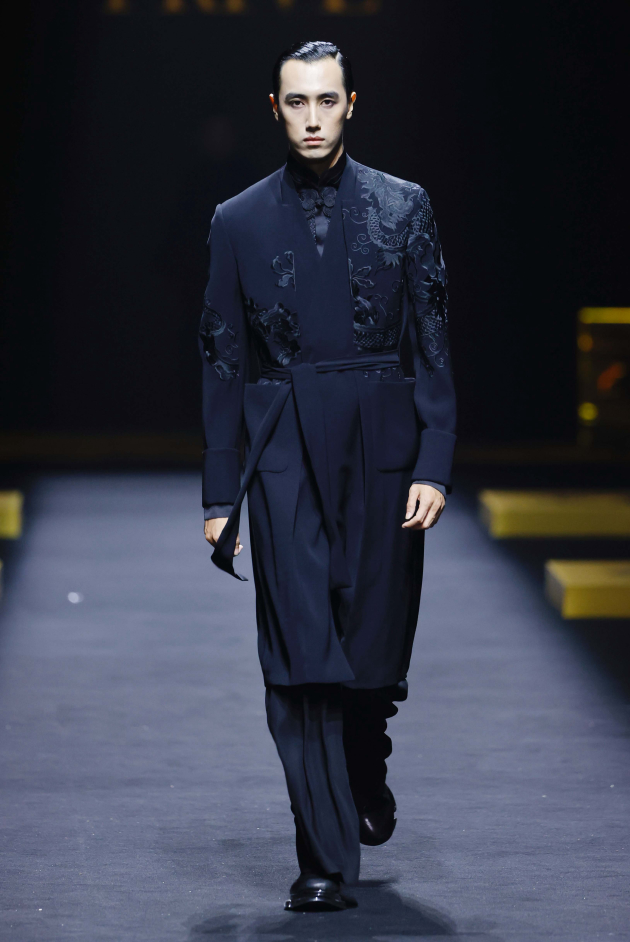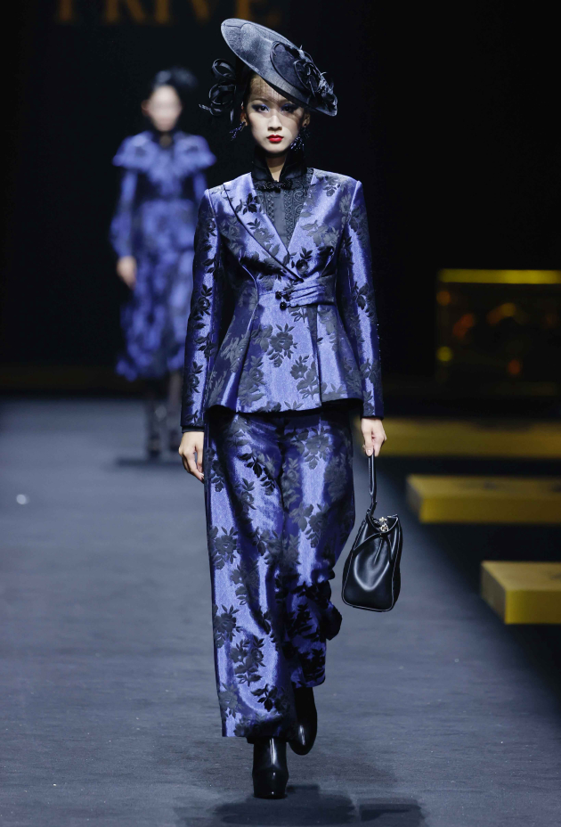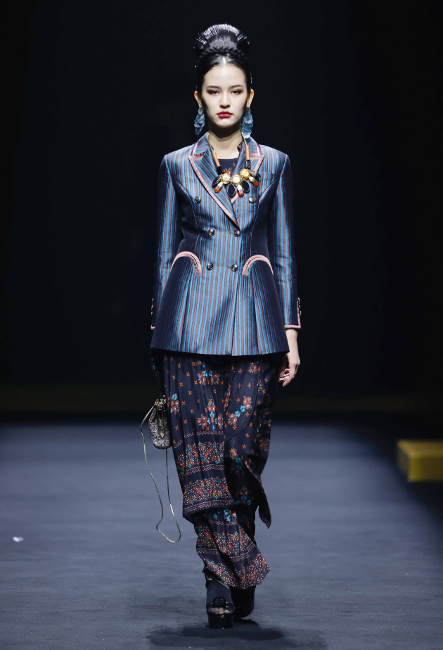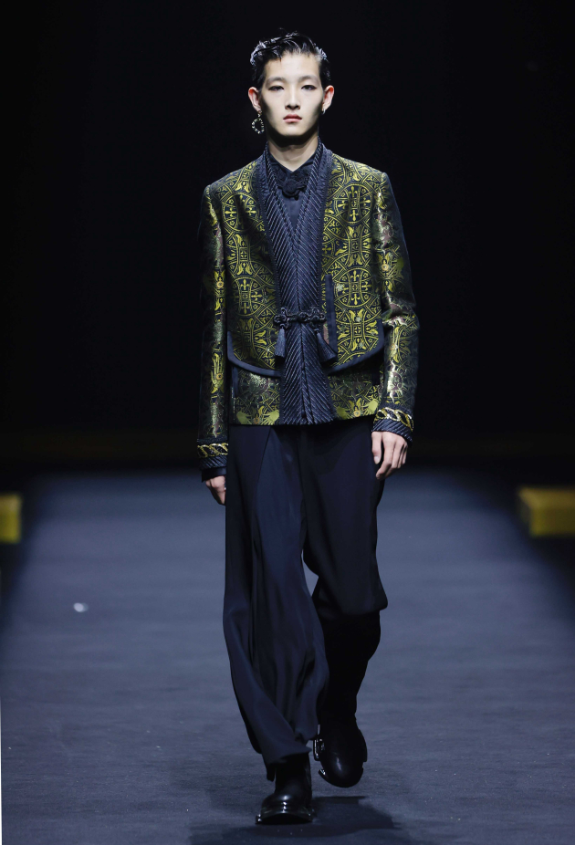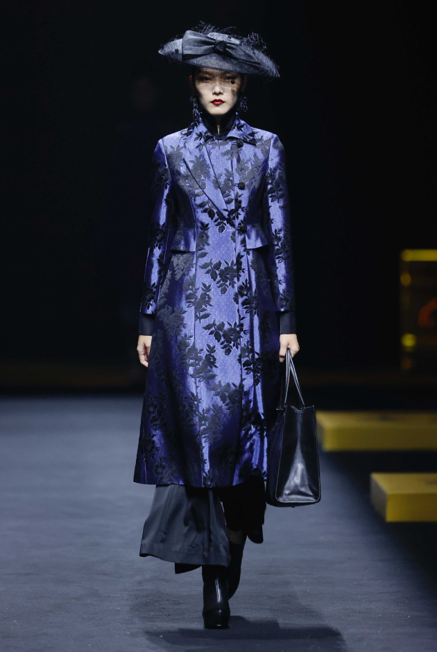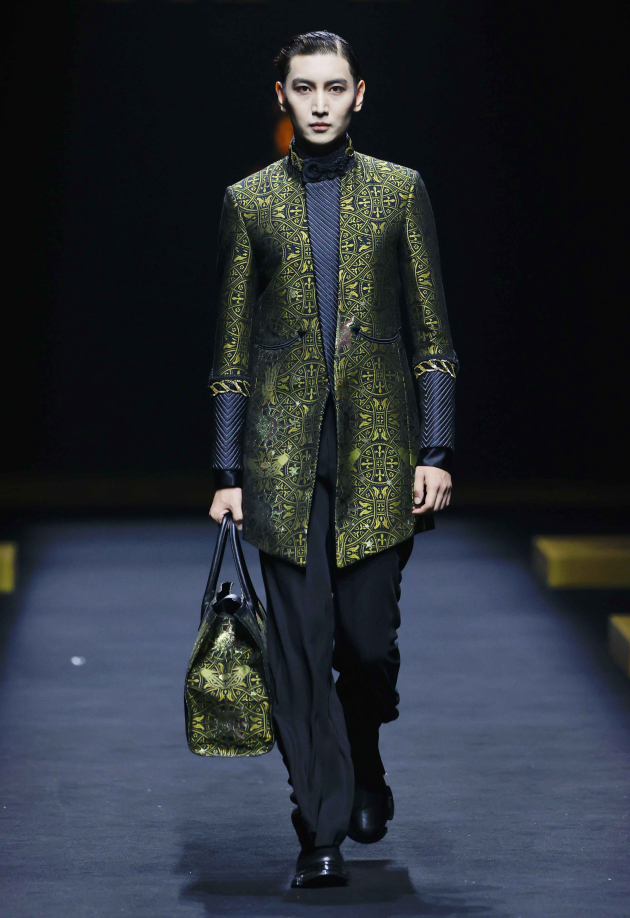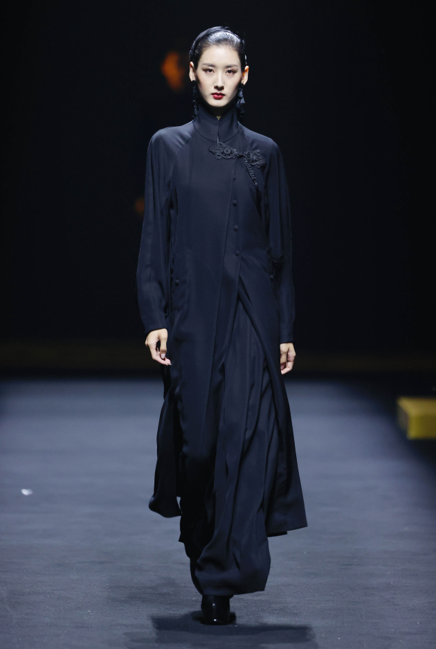 而在服装结构和剪裁上,中式美学与西式裁剪交融,结构、廓形的交错连贯,凸显松与紧,简与繁的平衡,将人体与服装的立体空间关系独具匠心的展现。同时此次大秀作品中大量使用了丝绸、丝毛混纺、精纺羊毛、三醋酸为主的高档舒适面料,采用提花、定位花、刺绣、活性印染等高精工艺呈现设计师对主题灵感的阐述,更多的是体现设计师对于中国文化在精神层面的理解,尊重文化的沉淀,却又不拘泥于形式,寻求自我审美的创造。