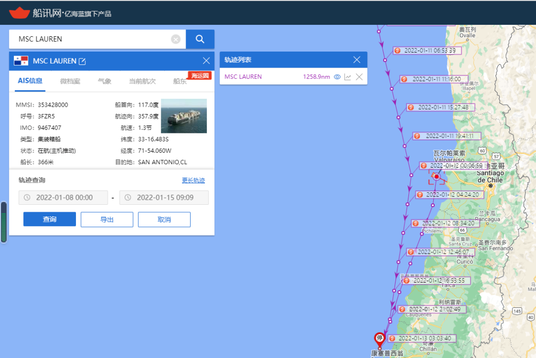 据智利当地媒体报道,近日,一艘悬挂巴拿马船旗的名为MSC Lauren 的大型集装箱船舶在抵达智利圣安东尼奥港后经检查发现该轮上有两名新冠核酸检测呈阳性。