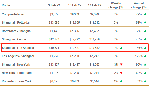 价格方面也依然高企。如深圳港口至纽约港口的集装箱海运价格,虽然1月份出现过价格回落,但是节后随着出货量回升,每个集装箱价格比节前贵了2000美元,达到15000美元,而且仍在不断上涨。相比2020年初涨了四五倍,彼时这条航线的集装箱价格在3000美元左右。