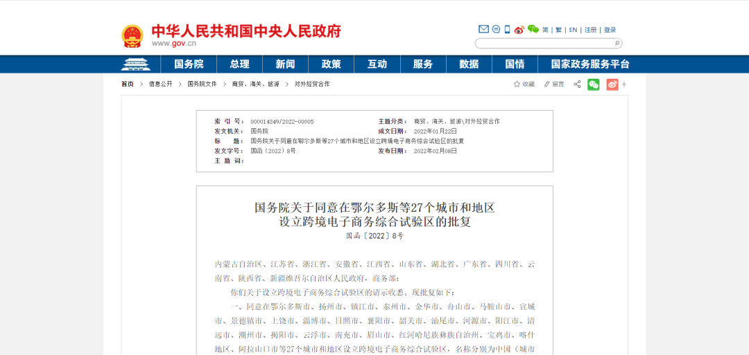 设立跨境电子商务综合试验区的批复