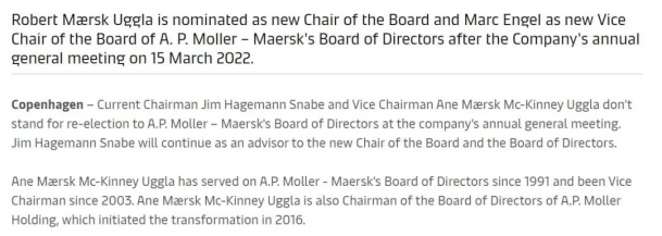 马士基2月15日在官网宣布新一届董事会高层调整。Robert Maersk Uggla被任命为马士基董事会新主席,Marc Engel担任副主席。
