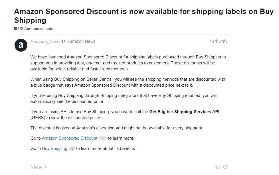 亚马逊为通过"Buy Shipping(购买运输)"计划购买运输标签的卖家提供新的运输折扣(Amazon Sponsored Discount)。 亚马逊在今天宣布了这一计划,卖家正试图了解新的折扣何时适用