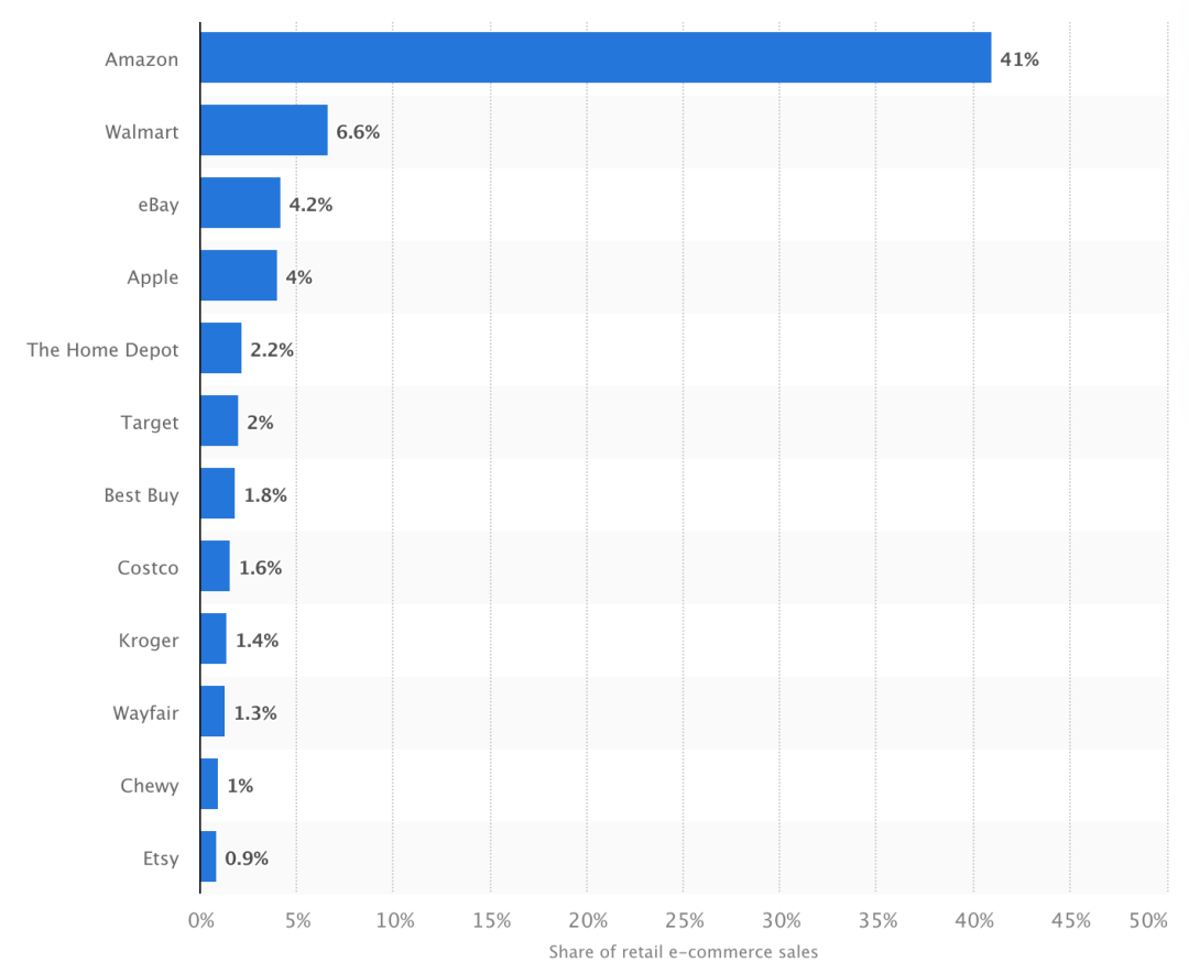 根据Statista提供的数据,亚马逊以41%的市场份额,占据美国电商平台市场占有率第一的排名。