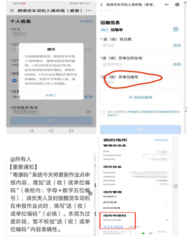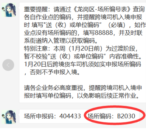 跨境货车司机入境申报材料所需要填报的"场所编码",该号码为:字母+4位数字,经了解,该"场所编码",有些是街道办防疫网格员直接联系给到企业场所的,有些是企业场所向所属街道办网格员要到的。