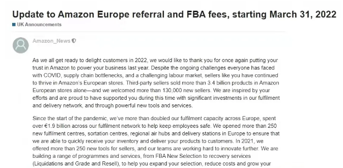 近日,亚马逊欧洲站发布公告称,为帮助英国和欧盟卖家发展业务,欧洲站将于3月31日起更新推荐费以及亚马逊物流费用(FBA)。