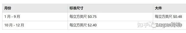 10月-12月,标准尺寸商品,每立方英尺$2.40;大件商品,每立方英尺$1.20。