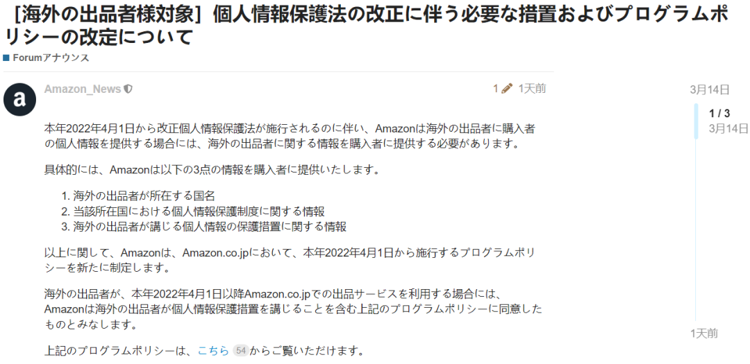 3月14日,亚马逊日本站发布公告称,自2022年4月1日起,《个人信息保护法案》修订案将正式生效。届时,当亚马逊向日本境外卖家提供买家的个人信息(包括姓名和地址)时,该境外卖家将被告知需要向买家提供其相关信息。