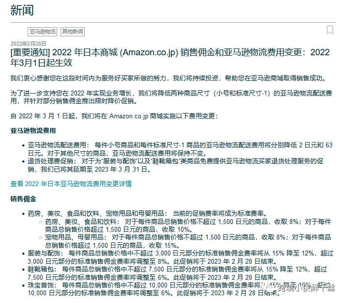 相对于亚马逊美国站的"涨声一片"(FBA配送费、物流费不断上涨),日本站可算是一股清流,"跌跌不休"。不信你看下面,我从日本站后台截图出来的,2月28日发出的关于日本商城销售佣金和亚马逊物流费用变更的通知。