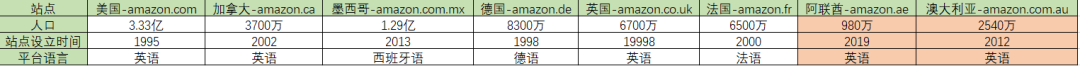 首先,我们看下目前亚马逊各个主力站点的横向比较,包含我们今天要研究的亚马逊阿联酋站点和亚马逊澳大利亚站点