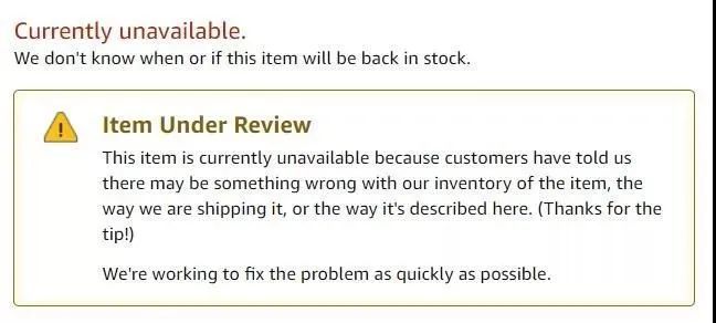 打开前台链接,显示亚马逊库存有异样。这意味着有买家反馈产品库存有问题,所以限制了卖家对该产品的销售权限,需要审批后才能恢复正常。