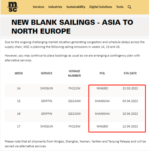 由于目前充满挑战的市场形势导致整个供应链出现拥堵和进度延误,MSC计划在第14、15和16周取消以下几次航行。不过,由于MSC安排其他服务的应急计划,客户可以进行预订。请注意,所有来自宁波、上海、厦门、盐田和丹戎帕拉帕斯的货物将通过替代服务送达。