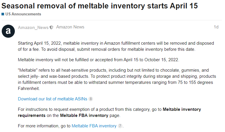 亚马逊美国站发布《2022年4月15日开始对易融性库存进行季节性限制》的公告:在2022年4月15日至2022年10月15日期间,亚马逊运营中心将不配送或不接受易融性商品。