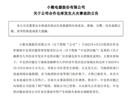 4月5日下午,小熊电器(002959,SZ)对外发布一则公告称,4月1日9点40分左右,公司的合作仓库湖南中仓供应链管理有限责任公司(以下简称中仓供应链)发生火灾,导致小熊电器的存货发生损毁。发生火灾事故的仓库位于湖南省湘潭市九华经济开发区综合保税区内。