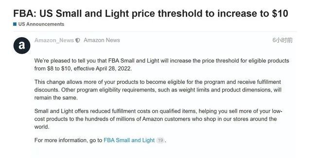 自2022年4月28日起,亚马逊物流轻小商品计划将符合条件的商品的价格门槛从8美元提高到10美元。