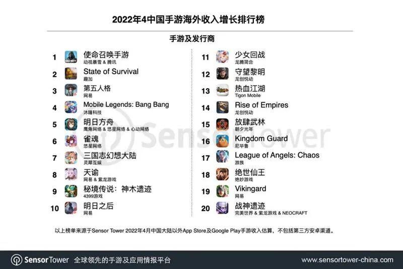 上周, Sensor Tower 发布 2022 年 4 月中国手游海外收入增长榜单。上榜游戏中,悠星网络旗下的《雀魂》,位居第 6 名,2022 年首次进入榜单。