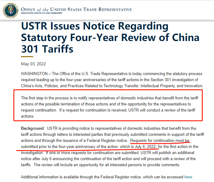 USTR必须在两项加征关税行动四周年前的60天窗口期内收到行业代表复审请求:
