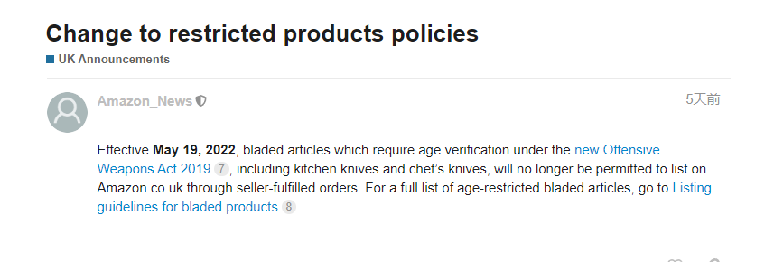 目前,尽管亚马逊英国站仍允许销售这些刀具,但必须使用亚马逊指定的FBA分销方式。仅采用自送配送方式的销售商不得将此类有年龄限制的产品上架。