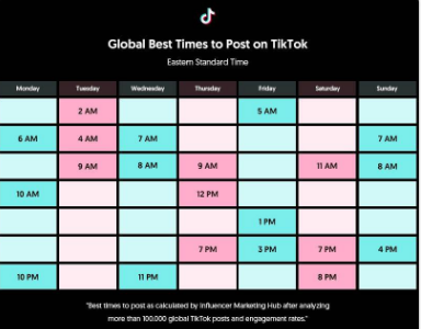 如果在非用户的活跃时间段上传内容,观看量会受到一定的影响。 根据 Influencer Marketing Hub 数据,以下是 TikTok 上发布的最佳时间(美国东部标准时间)。如果想要视频获得观看,应该在特定的时间进行发布。