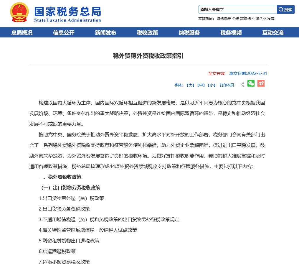 中国国家税务总局5月31日发布《稳外贸稳外资税收政策指引》,通知的下方附着《稳外贸稳外资税收政策指引汇编》各企业相关的增值税相关优惠的政策可以从中查看。