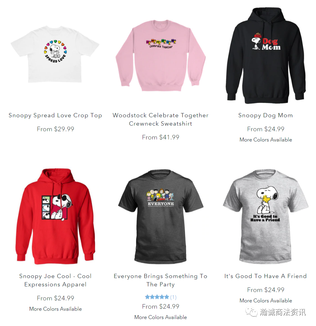 PEANUTS(花生)长篇连载漫画是由作者Charles M. Schulz(查尔斯·舒尔茨)于1950年10月2日开始推出,主角是SNOOPY史努比。SNOOPY是原告Peanuts Worldwide LLC.的主打品牌,该主题系列涵盖服装、日用品、文具、玩具等产品。今年原告数起发案涉及商标和版权侵权行为。品牌官网为:,官网上所展示的品牌商标及图案早已被原告登记注册,卖家朋友擅自使用则可能因构成侵权而被诉。以下是在其官网上部分产品截图: