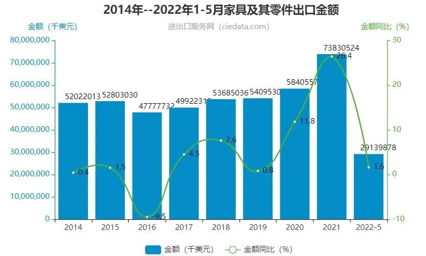 据CIEDATA进出口统计数据显示,2022年1-5月,我国家具及其零件出口金额为29139878千美元,同比增长1.6%。