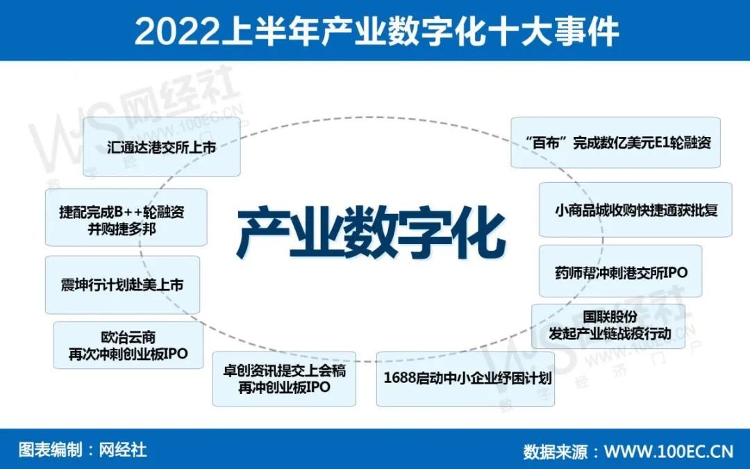 网经社产业电商台(B2B.100EC.CN)长期跟踪产业数字化厂商,以下为我们通过第三方视角对2022年上半年产业数字化十大事件进行盘点。(详见网经社专题:2022上半年数字经济系列盘点:上市不断 裁员频繁 各领域喜忧参 >