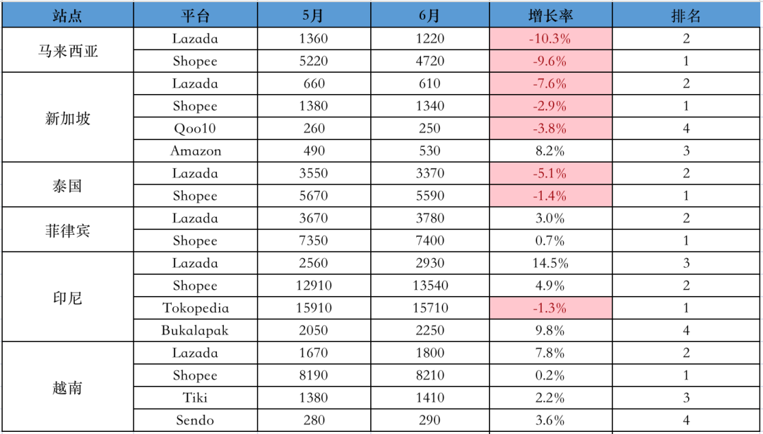 就总量来看,6 月份 Lazada/Shopee 各站点(马来西亚、新加坡、菲律宾、泰国、印尼、越南)网站总访问量为 5.45 亿,较上月的 5.42 亿仅上涨 0.6%;