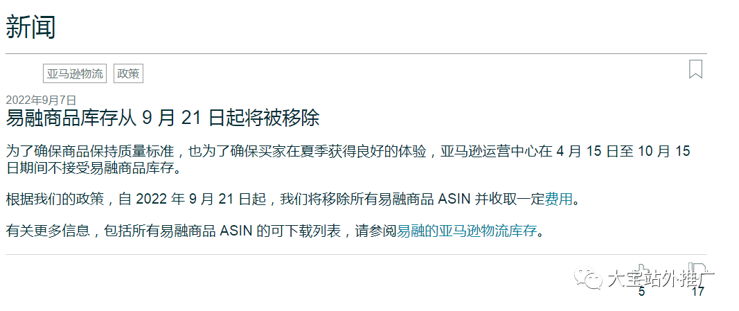 亚马逊为了确保商品保持质量标准,也为了确保买家在夏季获得良好的体验,亚马逊运营中心在 4 月 15 日至 10 月 15 日期间不接受易融商品库存。