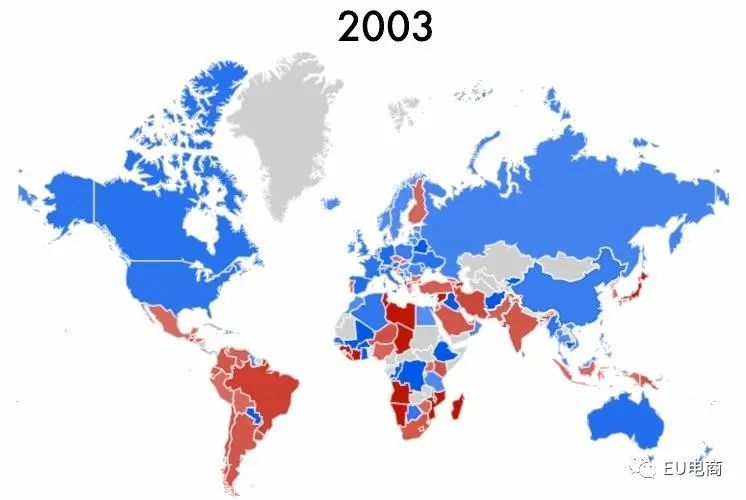 图片显示,用红色和蓝色代表这一年在谷歌上更受欢迎的搜索词——标为红色的国家对亚马逊的搜索量更多,而标为蓝色的国家对eBay的搜索量更多。颜色的深浅则表示该区域中领先搜索词的搜索百分比。