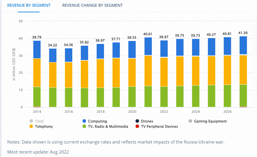 近年来,巴西市场消费电子类目需求持续增长,根据Statista数据,到2022年底巴西消电市场零售总规模将达到389.8亿美元,并且以年复合增长率1.17%的速度增长。在接近400亿美元的庞大市场中,12.9%为线上销售,属于典型的高增长蓝海市场。