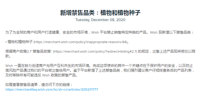 12月8日,Wish发布公告《新增禁售品类:植物和植物种子》。