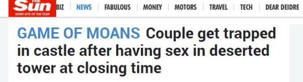 当他们到达100英尺(30米)高的废弃塔顶时,他们情不自禁地开始亲吻和拥抱,在窗台上嬉闹随后开始啪啪,就像是热播电视剧《权力的游戏》(Game Of Thrones)中的场景一样。