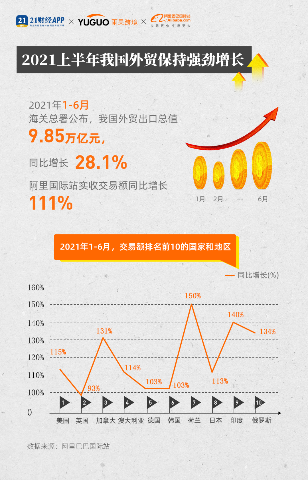 "今年上半年,我国货物贸易出口总值9.85万亿元,增长28.1%。"海关总署最新公布,我国外贸进出口已连续13个月实现同比正增长,同时跨境电商等新兴贸易业态也显示出蓬勃发展势头。阿里巴巴国际站今天(7月14日)发布平台最新半年报,数据显示,今年上半年平台交易额同比增长111%。(媒体联合阿里巴巴国际站发布"新外贸指数")随着疫情的逐步缓解,全球经济持续复苏,带动了外部需求增加。今年上半年,社交场景