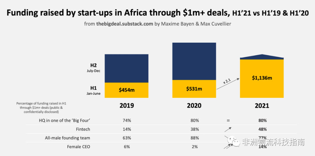 2021年H1过去了,非洲物流科技指南摘录了一些数据来让我们温习一下在疫情下的非洲初创企业的融资概况。在 21 年上半年,非洲初创企业筹集的资金超过了 19 年上半年和 20 年上半年的总和,达到了10亿美金。