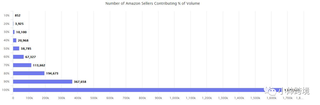 1、卖家金字塔结构面临重新洗牌。据不完全统计,2020年有近10亿美元的新资本涌入市场,用于收购或投资亚马逊卖家和品牌。如下图显示,2020年,850位亚马逊大卖贡献了亚马逊全站点10%的GMV,38000余名卖家贡献了50%的GMV,总的来说,360000余名亚马逊卖家贡献全站点90%的GMV。不难看出,随着亚马逊市场GMV的一再增长,TOP卖家所占的比例越来越小,数量更多的小卖家创造的GMV数额越来越高。随着小卖家和新手卖家的入场,大卖家的增长也越来越难。