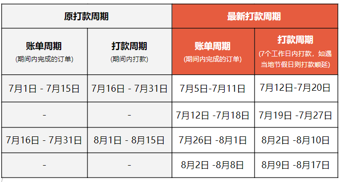 新规则首次执行时间段:账单周期为7月5日-7月11日,打款周期为7月12日-7月20日。