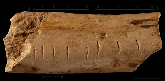 约6万年前,在如今的法国西部,一个尼安德特人拿起了一块鬣狗的腿骨和一枚石器开始干活,事情做完后,鬣狗腿骨上留下了9条非常相似、近乎平行的切痕,似乎代表了某种含义。